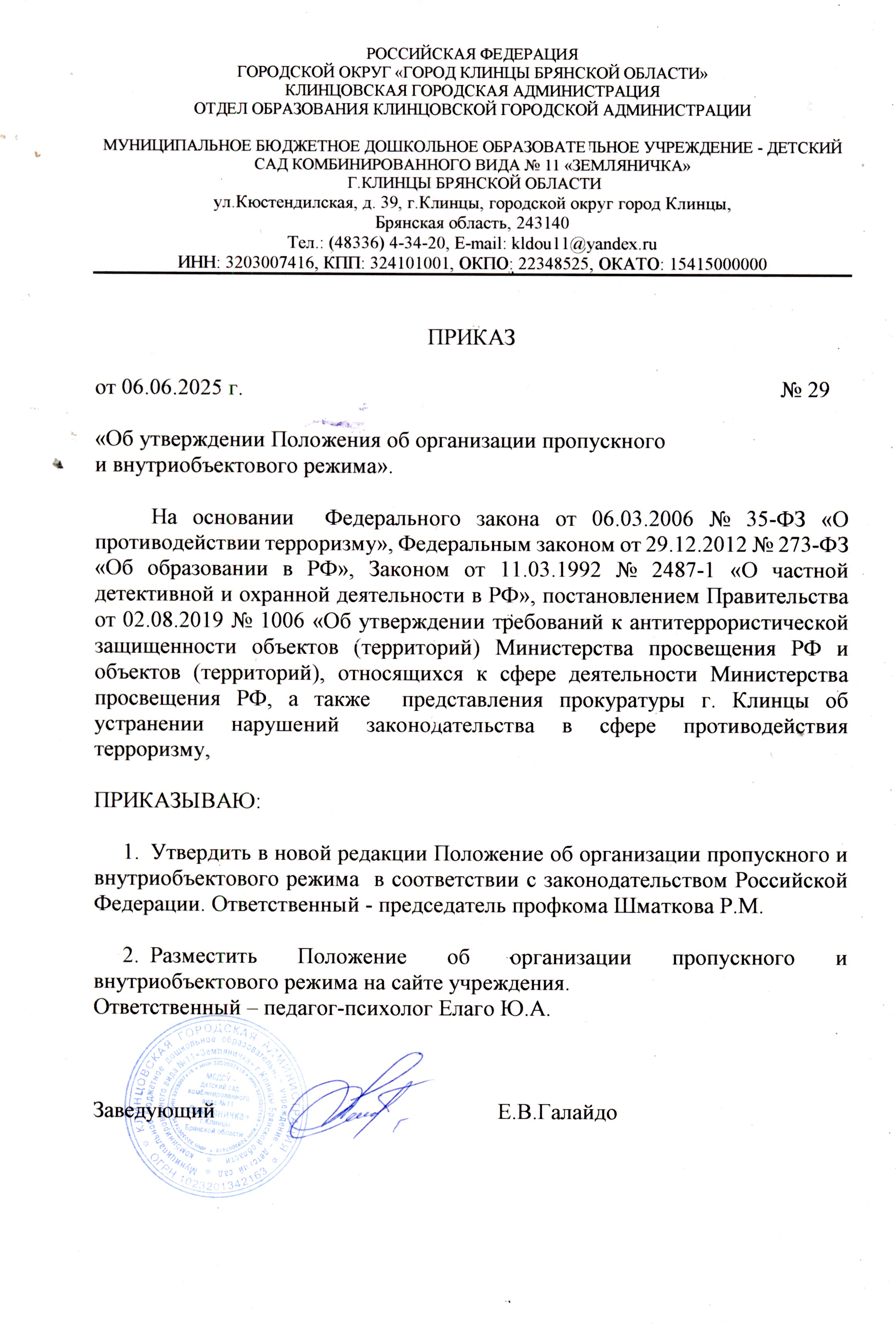 - Приказ об утверждении Положения "О пропускном и внутриобъектовых режимах в ДОУ"